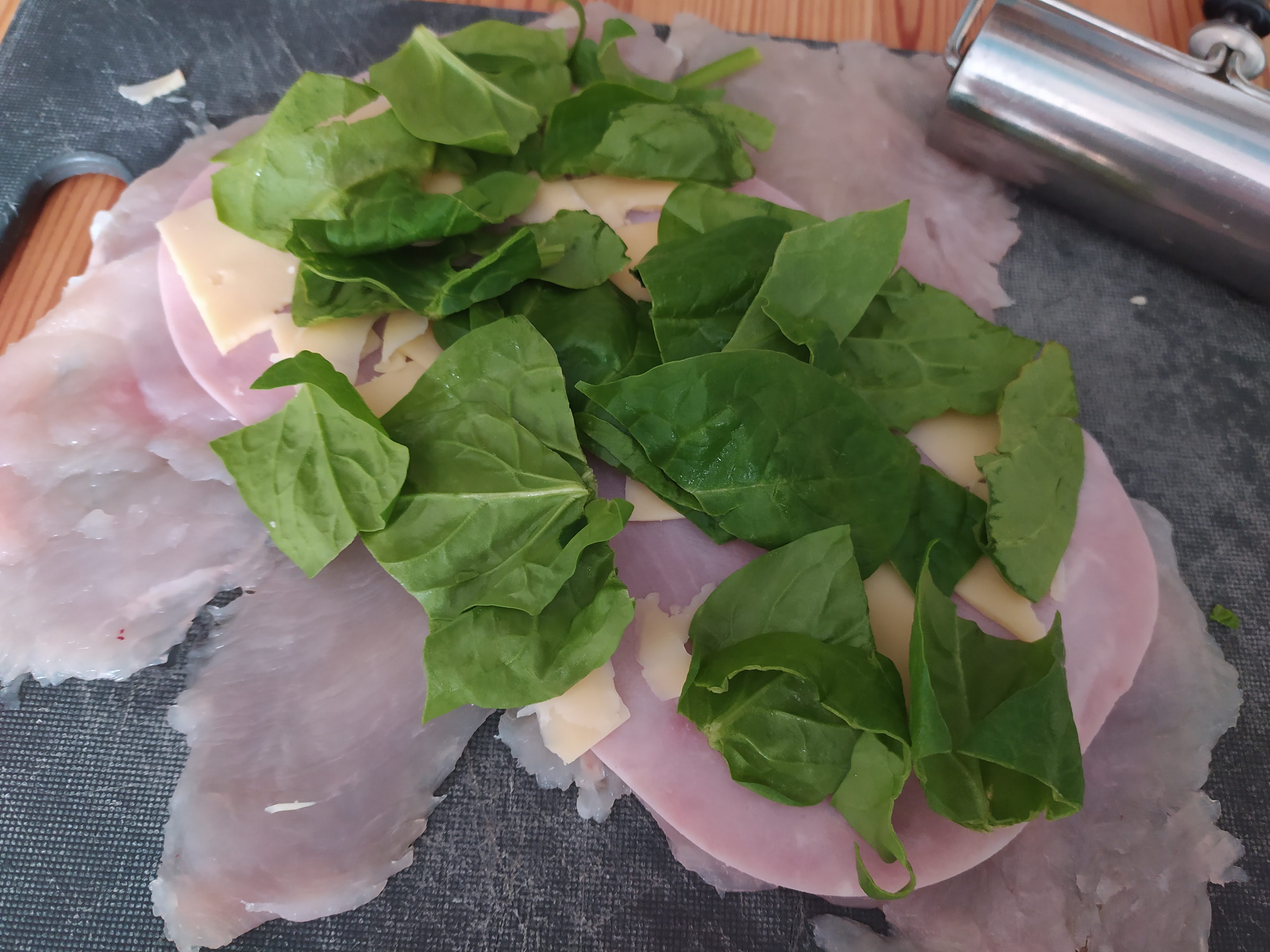 Colocamos la pechuga abierta sobre un film transparente. Cubrimos con otra lámina de film transparente y pasamos un rodillo por encima para aplanarla y estirarla. Quitamos el film de arriba, salmpimentamos la pechuga y colocamos la loncha de jamón cocido, dentro el queso y por último las hojas de espinacas.