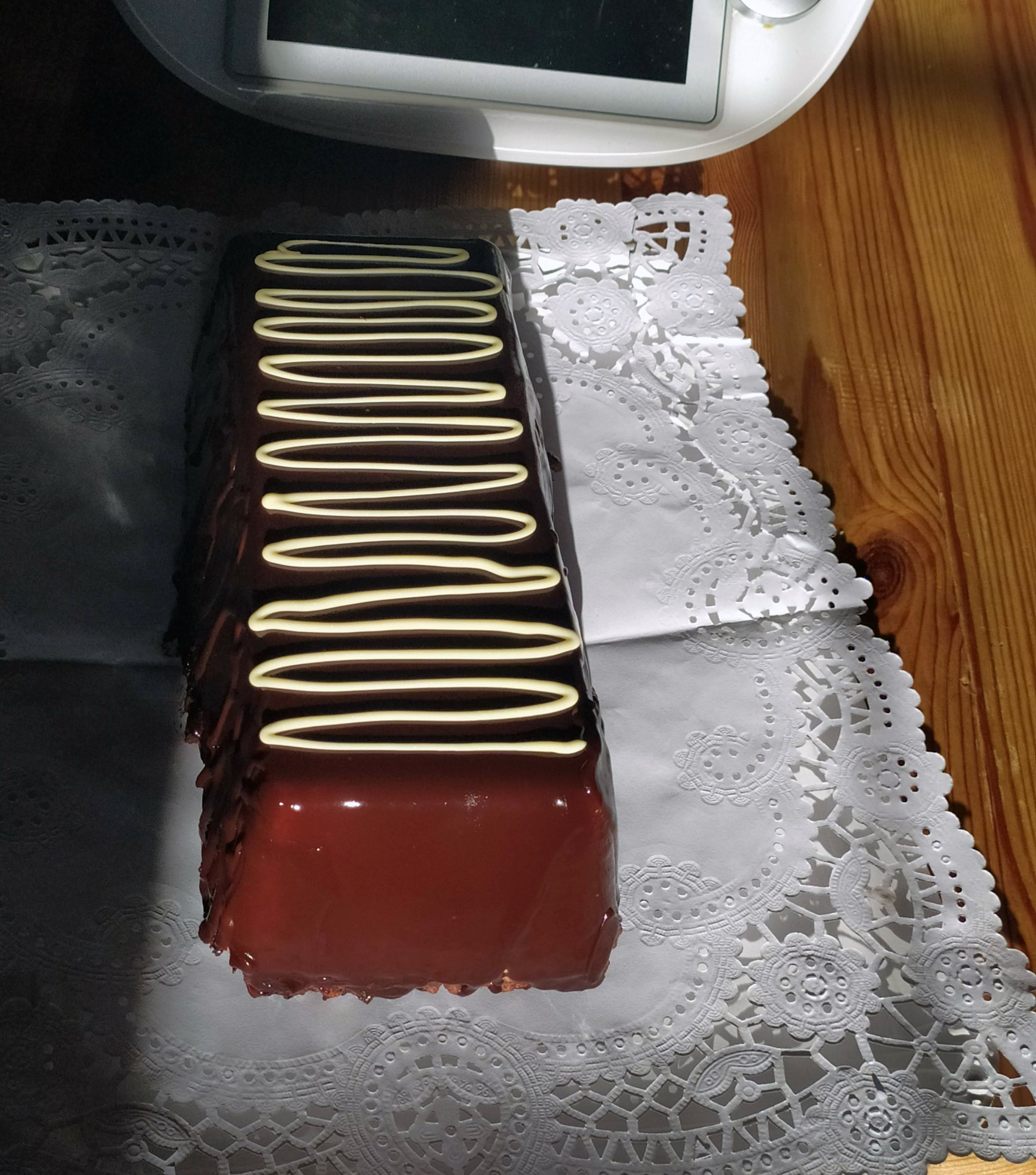 Desmoldamos la mousse que tenemos en el congelador sobre una rejilla. Bañamos el brazo con la cobertura ya templada. Llevamos al congelador.