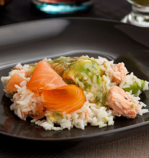 Para emplatar, ponemos el arroz en una fuente, encima el salmón al vapor cortado en trozos, encima las láminas de salmón ahumado y los trozos de aguacate. Decoramos con un poco de eneldo y pimienta negra recién molida. Se sirve templado o frío acompañado con la salsa de eneldo.